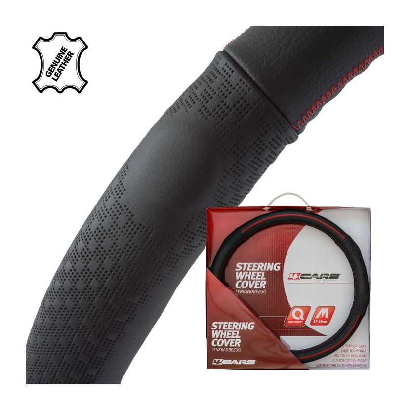 Luxusní kožený potah volantu 4Cars z pravé černé kůže. Zlepšuje úchop, chrání volant před opotřebením a zajišťuje příjemný kontakt rukou v létě i v zimě. Určeno pro volanty o průměru 37–39 cm.