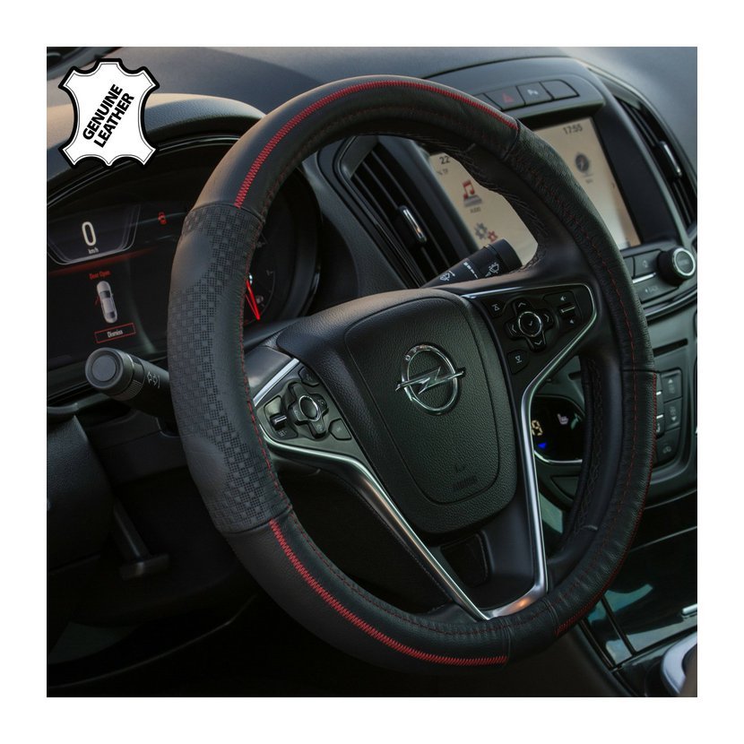 Pravá černá kůže působí luxusně a zároveň je velmi odolná. Červené prošití dodává sportovní charakter a zvýrazňuje interiér vozu. Potah výrazně zlepšuje úchop volantu, omezuje klouzání rukou a zvyšuje jistotu při řízení.