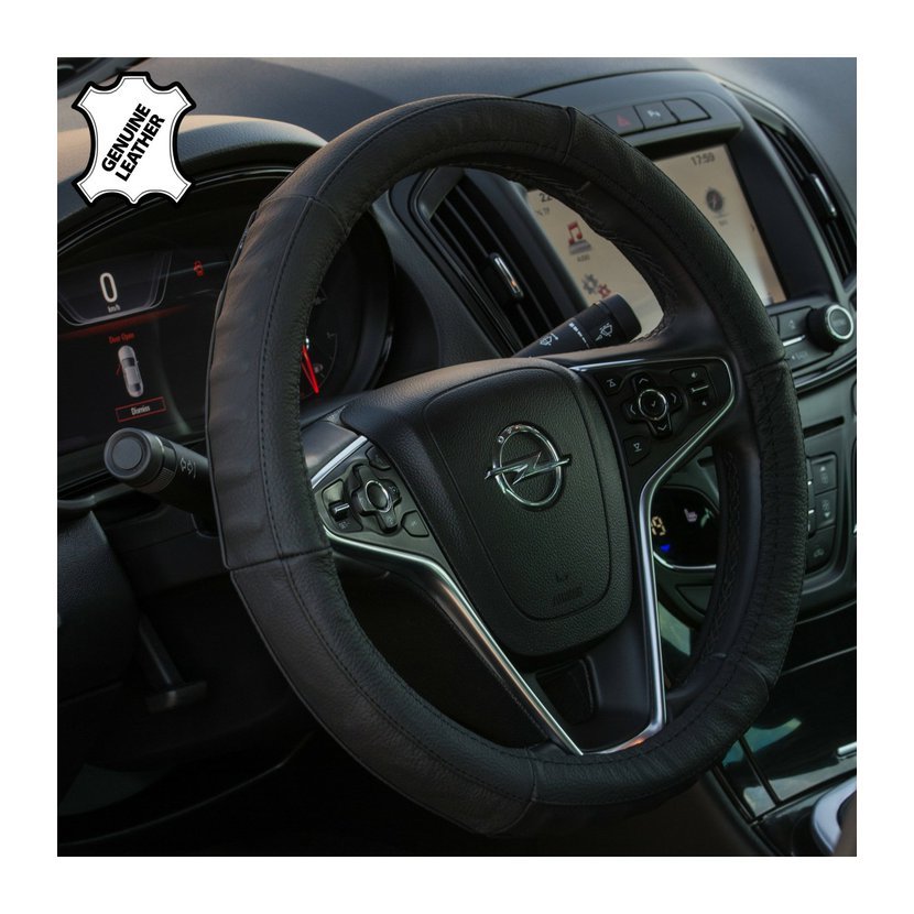 Pravá černá kůže působí luxusně a zároveň je velmi odolná. Ergonomická kombinace úchytu dodává potahu sportovní charakter a zvýrazňuje interiér vozu. Potah výrazně zlepšuje úchop volantu, omezuje klouzání rukou a zvyšuje jistotu při řízení.