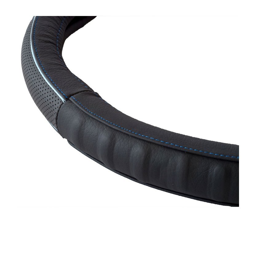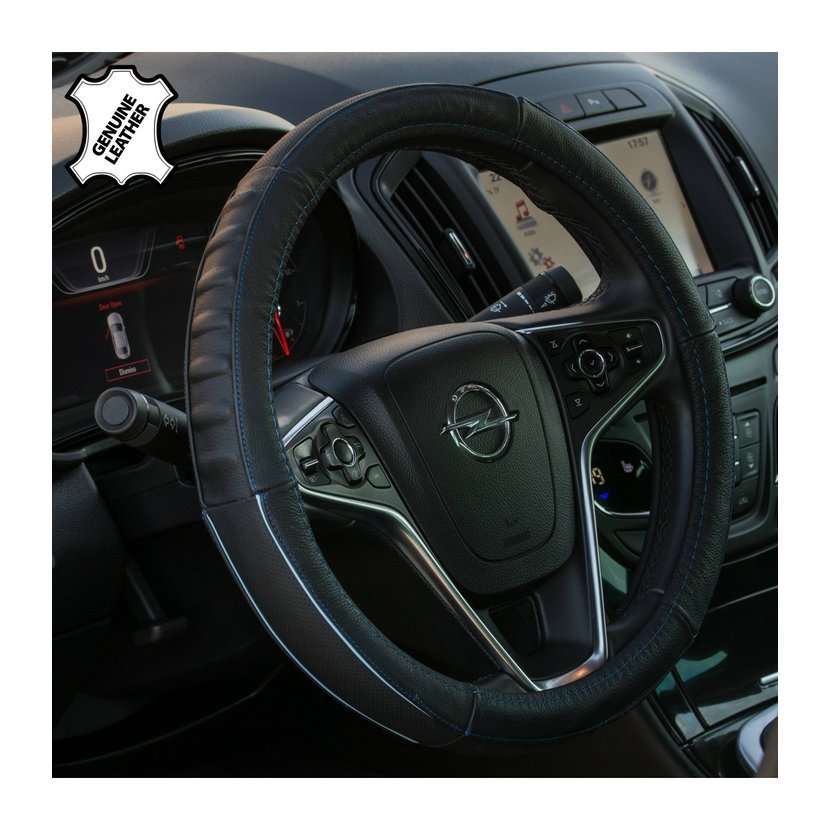 Pravá černá kůže působí luxusně a zároveň je velmi odolná. Modré prošití dodává sportovní charakter a zvýrazňuje interiér vozu. Potah výrazně zlepšuje úchop volantu, omezuje klouzání rukou a zvyšuje jistotu při řízení.