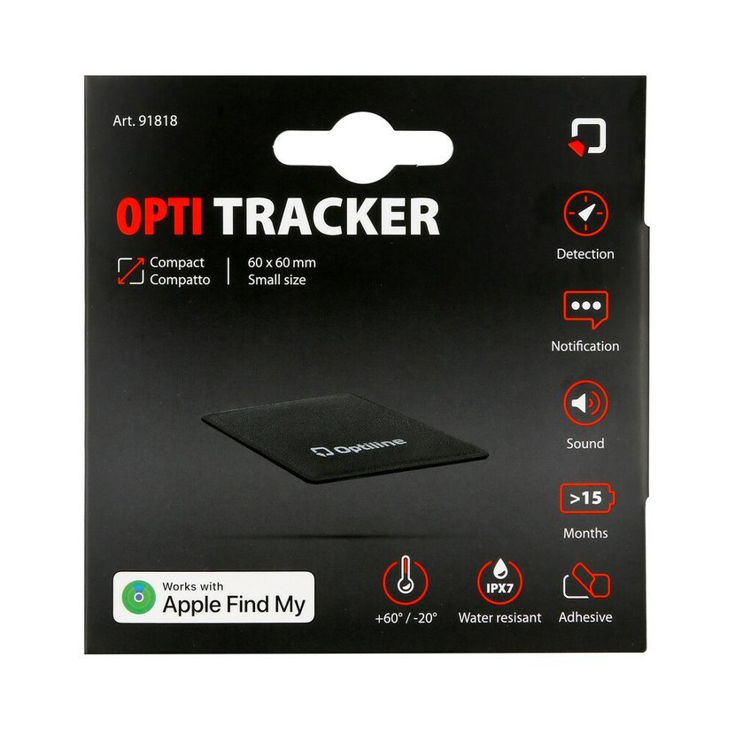 Opti Tracker Compact je moderní chytrý lokátor určený pro sledování a ochranu osobních i pracovních předmětů. Zařízení je plně kompatibilní s aplikací Apple Find My, která umožňuje vyhledání ztraceného předmětu prostřednictvím rozsáhlé sítě zařízení Apple.