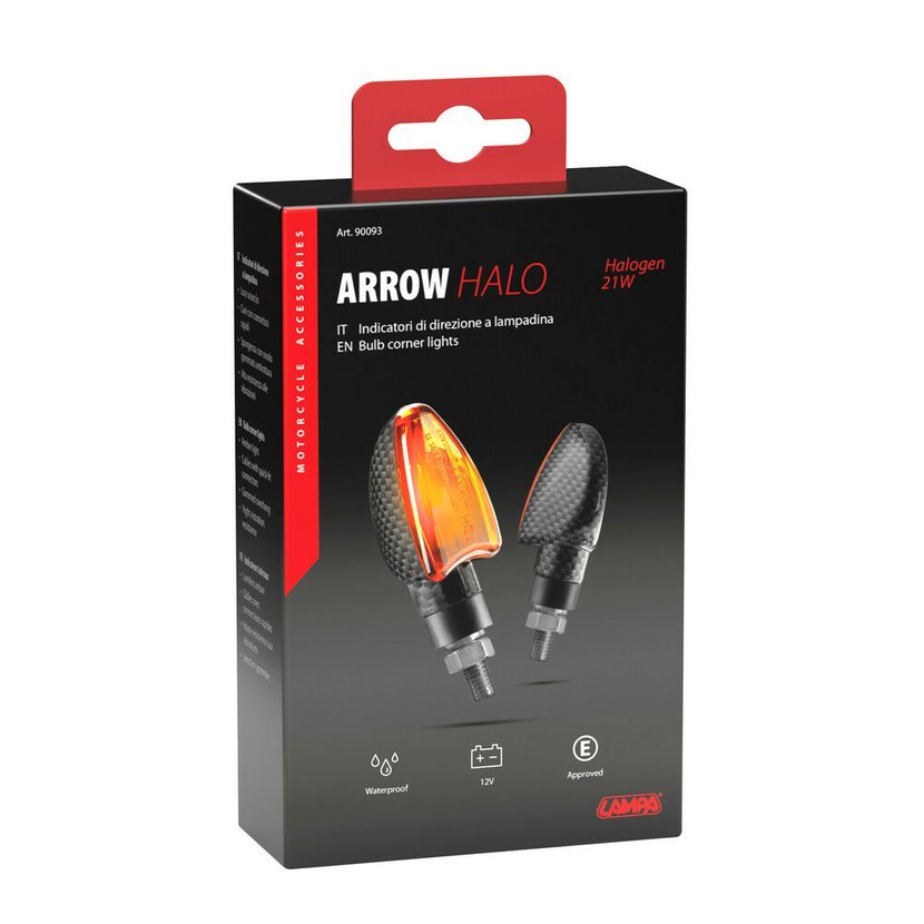 Model ARROW CARBON zaujme atraktivním carbon vzhledem s oranžovým sklíčkem, který dodá vaší motorce sportovní a dynamický charakter. Klasická žárovková technologie 12V/21W zajišťuje silné a dobře viditelné světlo, ideální pro každodenní provoz.