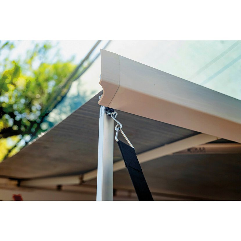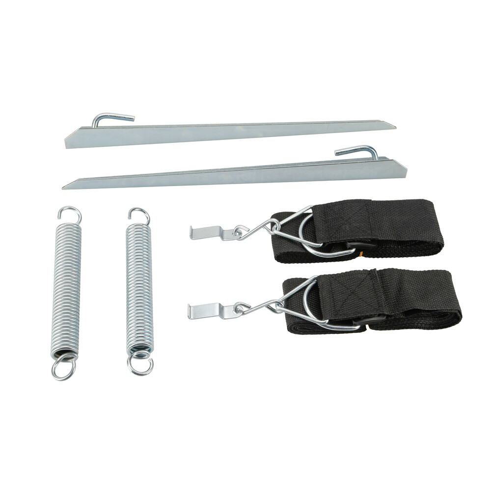 Systém je jednoduchý a přitom maximálně efektivní. Popruh se pomocí S-háku uchytí k tyči markýzy, druhý konec se ukotví do země pomocí ocelového kolíku. Integrované pružiny tlumí nárazy větru a vibrace, takže nedochází k přetěžování konstrukce.